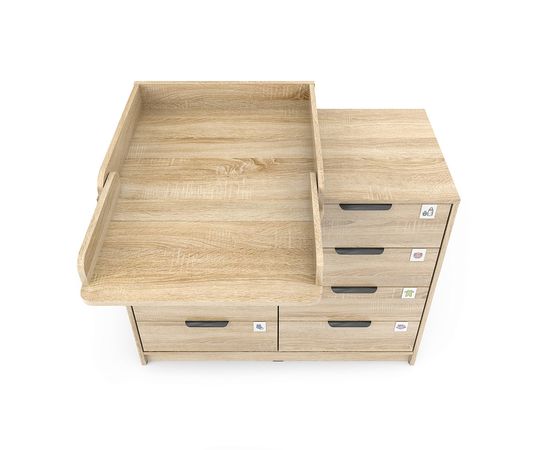 Пеленальный столик снимается и устанавливается одним простым движением, не оставляя никаких следов на столешнице, при этом надежно фиксируется через специальные металлические втулки в задний торец столешницы. Его можно установить в 3 положения - слева, справа и по центру комода. Тем самым, вы сами определяете, с какой стороны останется место для средств по уходу за малышом.