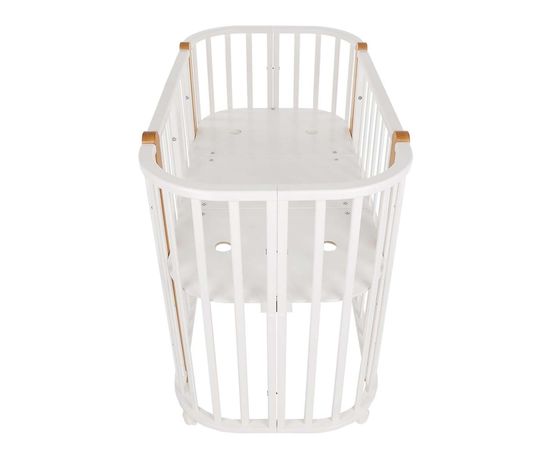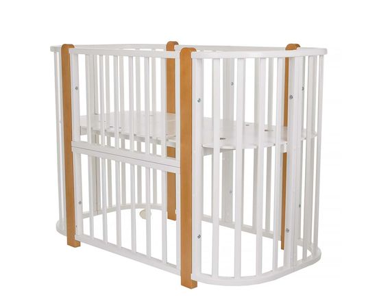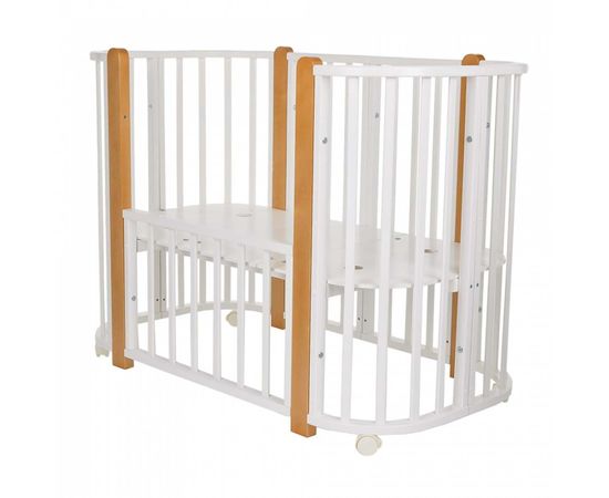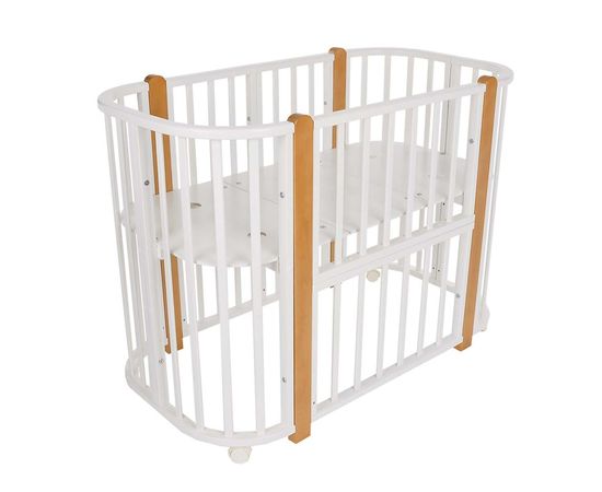 У кроватки простой, но очень красивый внешний вид. Она полностью безопасна для ребенка и не имеет острых углов. В комплекте с кроваткой идут колёса для удобного перемещения по комнате. Кроватка проходит в стандартный дверной проём. Трансформируется в колыбель 84*60 см, колыбель приставная 84*60 см, овальную кровать 120*60 см