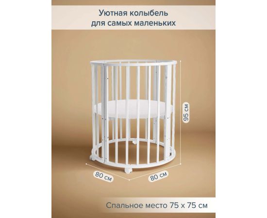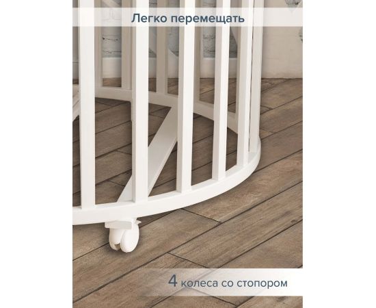 В первые месяцы жизни в круглой кроватке малыш чувствует себя очень комфортно! Девять вариантов трансформации позволяют использовать кроватку продолжительное время.
