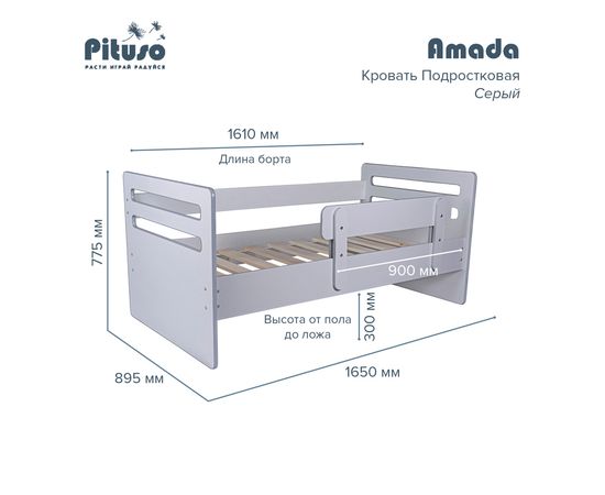 Кровать Подростковая PITUSO AMADA NEW -Одноярусная кровать предназначена для детей дошкольного и школьного возраста, Особенность модели – наличие заднего бортика: он предотвращает контакт с холодной стеной и одновременно защищает настенное покрытие от истирания.