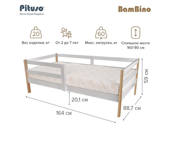 Подростковая кровать «PITUSO BAMBINO» – идеальный вариант для детей от 2 до 7 лет. Кровать имеет оптимальный размер спального места 160см*80см и высоту от пола до верхней точки ложе 20 см – это позволит ребенку после пробуждения свободно поставить ноги на пол и комфортно встать с постели. Съемные защитные бортики (в комплекте) с двух сторон уберегут ребенка от падения с кровати во время сна, которые можно установить как слева, так и справа или вообще без них.