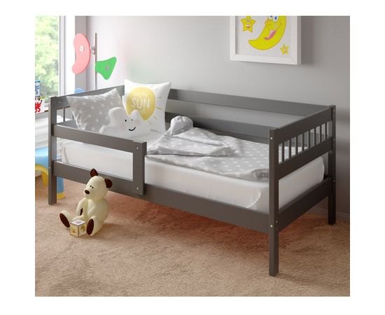 Для безопасности ребенка комплектуется одинарным бортиком, который можно установить как слева, так и справа или вообще без него.