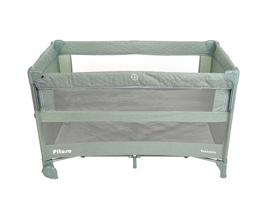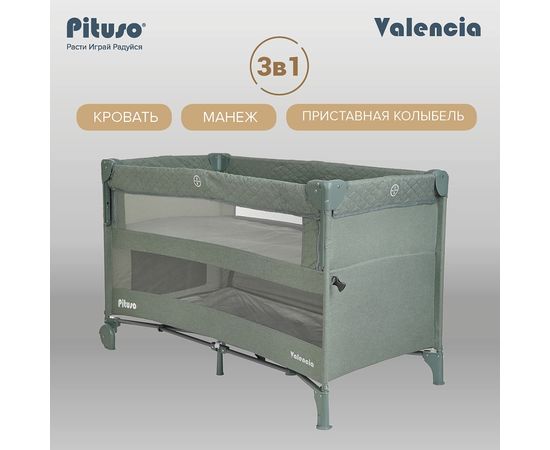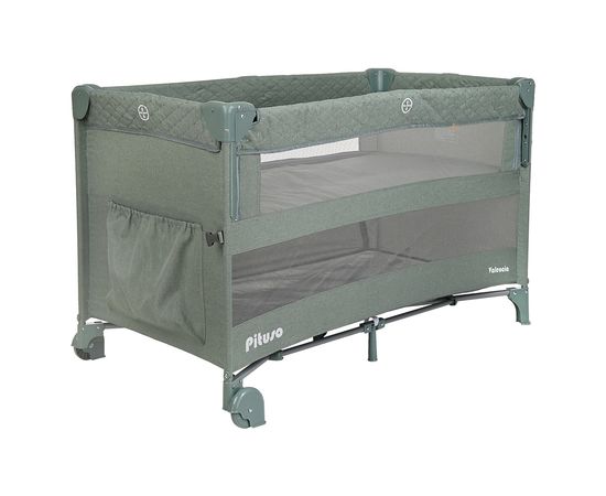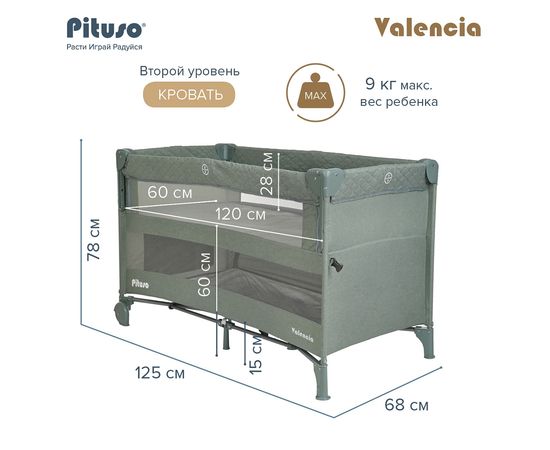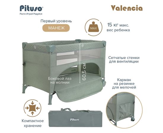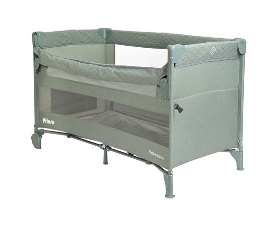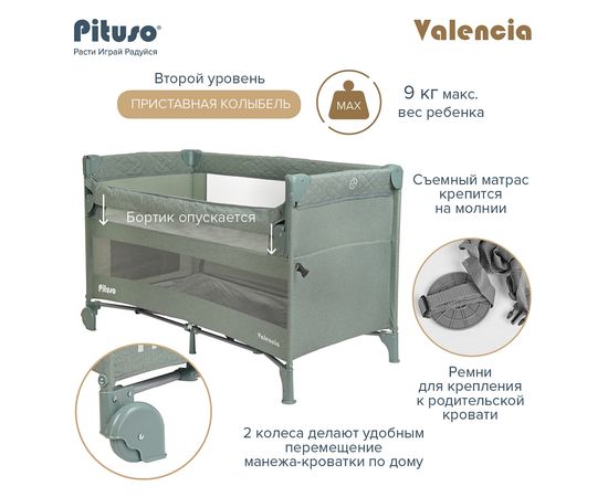 Двухуровневый манеж Pituso VALENCIA с функцией приставной колыбели создает безопасное, удобное и комфортное пространство, где ребенок может отдыхать и весело играть вместе с любимыми игрушками. Благодаря второму уровню манеж можно использовать вместо кроватки с самого рождения малыша. Манеж можно установить рядом с кроватью родителей и благодаря опускающемуся бортику использовать как приставную кровать. Кроватка надежно крепится к родительской кровати с помощью ремней.