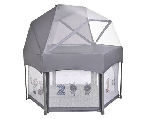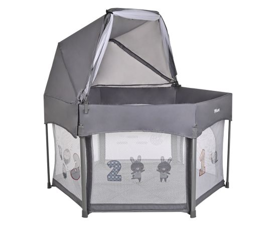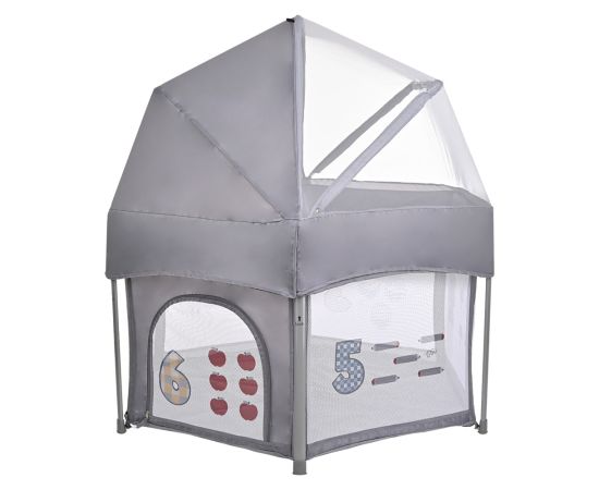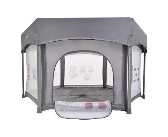 - Манеж оснащен водонепроницаемым дном и мягким матрасиком, который легко вытаскивается, а также есть съемная крыша и москитная сетка.