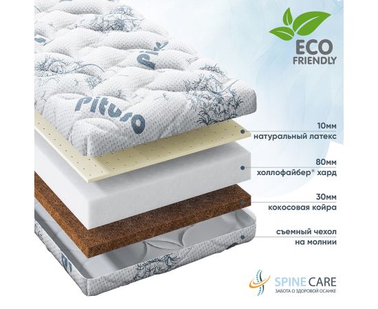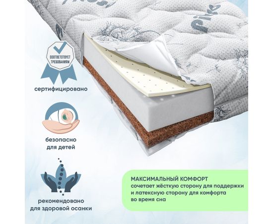 Повышенную ортопедическую жесткость одной из сторон матраса обеспечивает трипл-слой из натуральной кокосовой койры. Эта сторона подойдет как новорожденным малышам, так и деткам постарше.