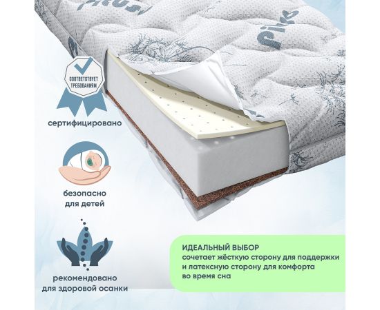 Одна сторона матраса обладает более жесткой поверхностью – здесь расположен слой из натуральной кокосовой койры. Это ортопедическая сторона, она подходит новорожденным малышам и поможет правильному формированию мышечного корсета.