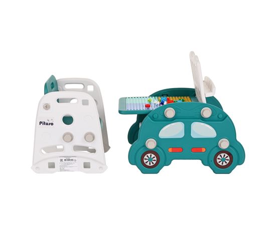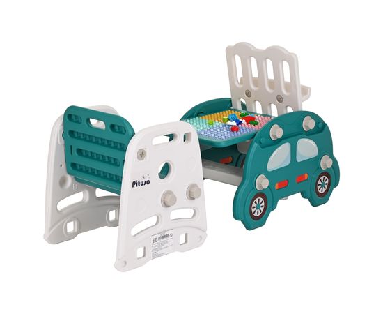 Стол и стульчик - столешница стола двухсторонняя: на одной стороне можно рисовать при помощи маркеров и фломастеров (2 шт. входят в комплект), играть с любыми игрушками, заниматься рисованием и другими играми, другая сторона предназначена для игр с конструктором. Конструктор, в количестве 62 элемента, также входит в комплект.