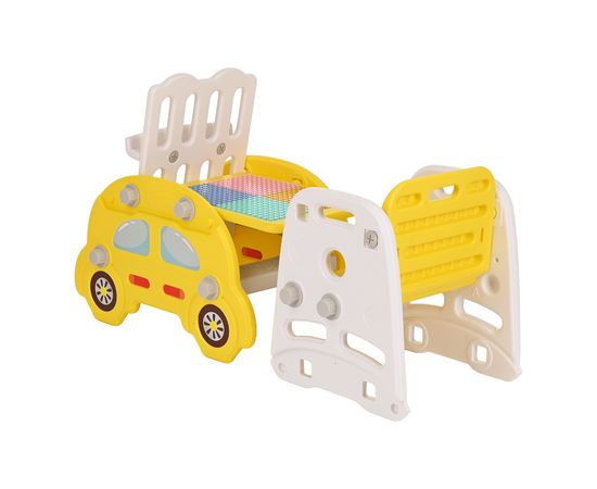 Стол и стульчик - столешница стола двухсторонняя: на одной стороне можно рисовать при помощи маркеров и фломастеров (2 шт. входят в комплект), играть с любыми игрушками, заниматься рисованием и другими играми, другая сторона предназначена для игр с конструктором. Конструктор, в количестве 62 элемента, также входит в комплект.