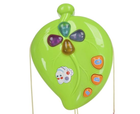 Развивающая игрушка представляет собой музыкальную подвеску в виде листочка с бабочками .