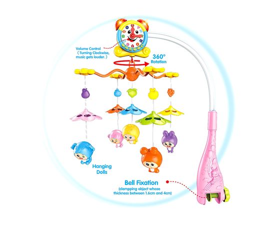 Она отлично привлекает внимание карапуза, тем самым развивает фиксирование взгляда на движущихся предметах, а встроенная музыкальная шкатулка с приятной мелодией прекрасно успокаивает.