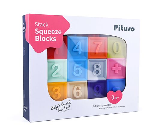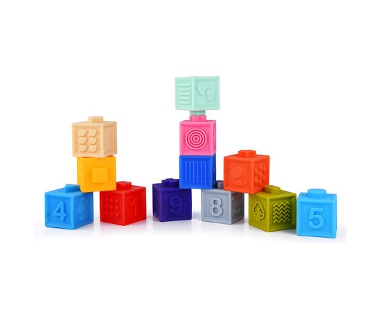 В комплект входят 12 кубиков с различными рельефными элементами.
