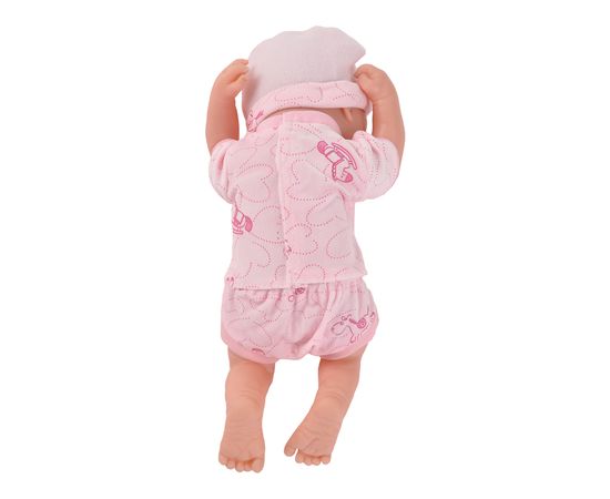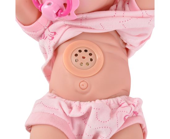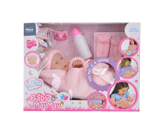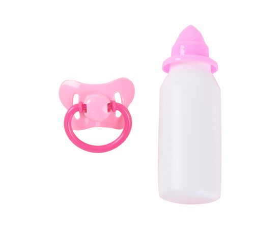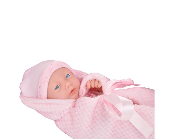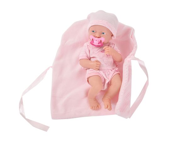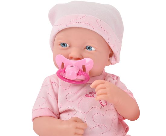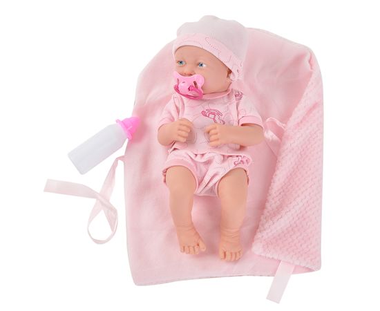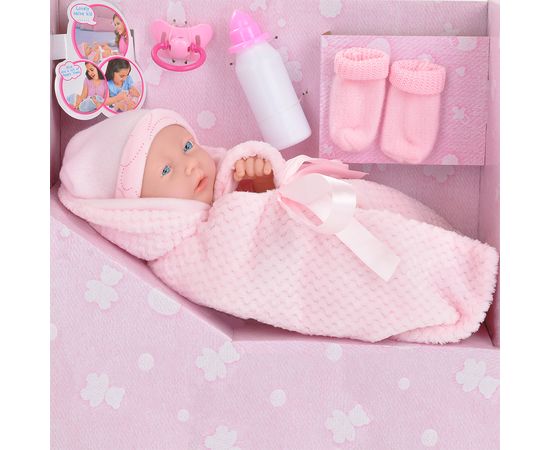 В комплекте: Пупс в боди и шапочке- 1 шт., одеяльце – 1 шт., бутылочка-1шт., пустышка - 1 шт, носочки – 1 пара.