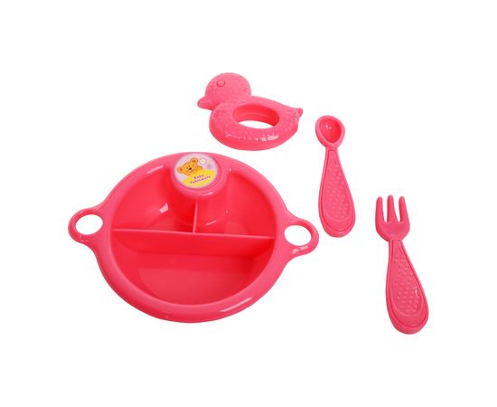 В комплекте: Пупс с одеждой - 1 шт., игрушка-погремушка -1 шт., тарелка-1шт., ложка - 1 шт., вилка-1 шт.