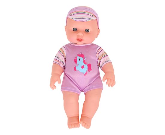 В комплекте: Пупс с одеждой - 1 шт., игрушка-погремушка -1 шт., тарелка-1шт., ложка - 1 шт., вилка-1 шт.