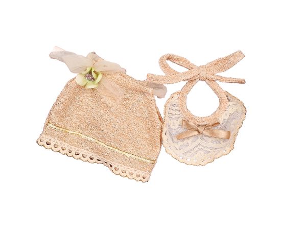 В комплект входят: Пупс в одежде -1 шт., нагрудник-1 шт., шапочка-1шт.