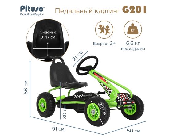 Педальный картинг PITUSO G201- это прекрасное сочетание велосипеда и автомобиля. Машинка приводится в движение вращением педалей, может ездить вперед и назад. Достаточно устойчив, чтобы не опрокинуться на повороте. Современный спортивный внешний вид. Картинг вырабатывает у ребенка навыки вождения.