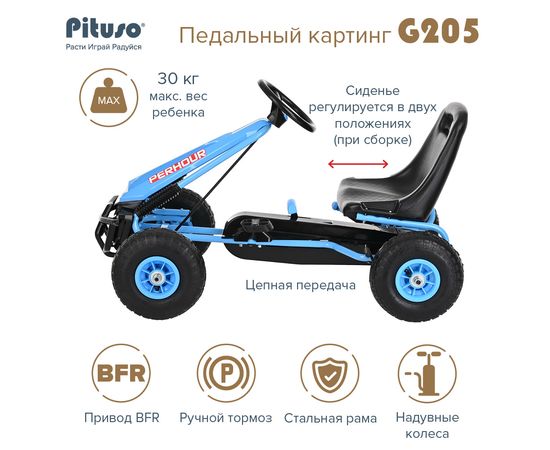 Педальный картинг PITUSO G205- это прекрасное сочетание велосипеда и автомобиля. Машинка приводится в движение вращением педалей, может ездить вперед и назад. Достаточно устойчив, чтобы не опрокинуться на повороте. Современный спортивный внешний вид. Картинг вырабатывает у ребенка навыки вождения.