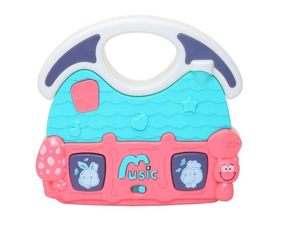 Развивающая игрушка представлена в виде домика и включает в себя 2 разноцветные клавиши с различными звуками (разных животных и мелодии) и светом.