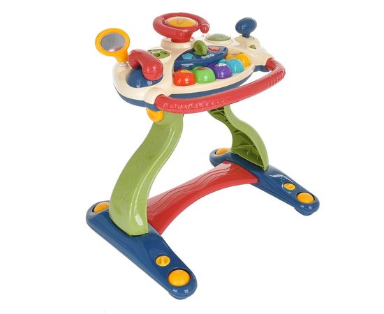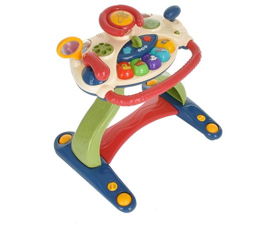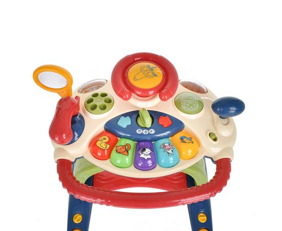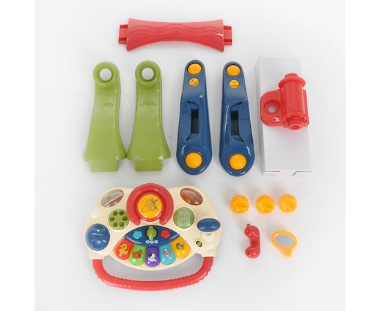 Привлекательная для малышей яркая игровая наклонная поверхность, на которой расположены различные кнопки, с изображением животных, руль, зеркало заднего вида, рычаги и другие предметы с разнообразными звуковыми и световыми эффектами.
