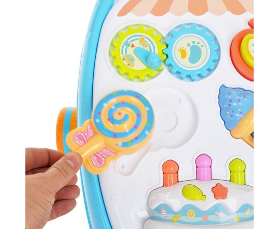 Игровая панель укомлектована различными интересными элементами в виде сладостей, поворачивающиейся круги со звуком трещетки, в комплекте есть шарики и кармашек для хранения. Элементы можно вытаскивать и играть отдельно.