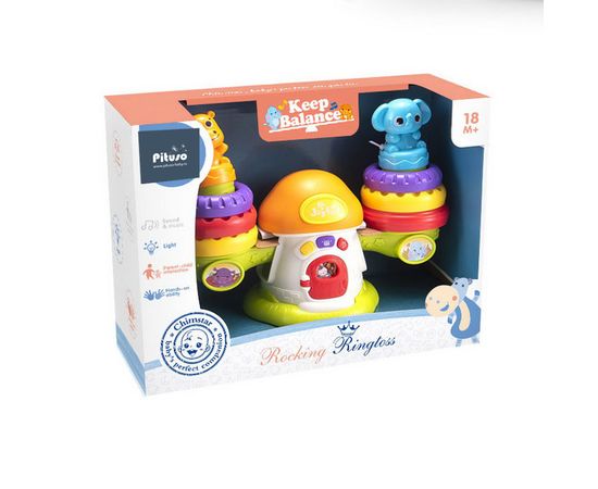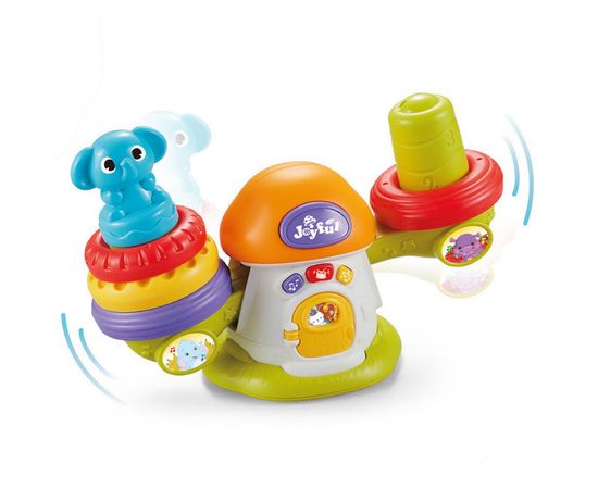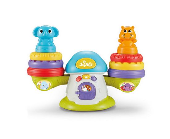 Малышу нужно будет хорошо потренироваться, чтобы научиться класть колечки и фигурки зверей с двух сторон одновременно, только так будет сохранено равновесие. А ещё кроха сможет послушать музыку, выбрав мелодии или звуки барабанов!