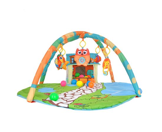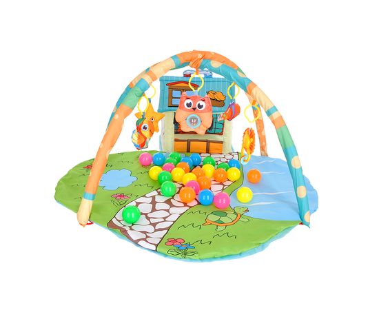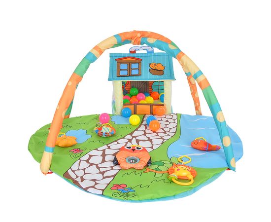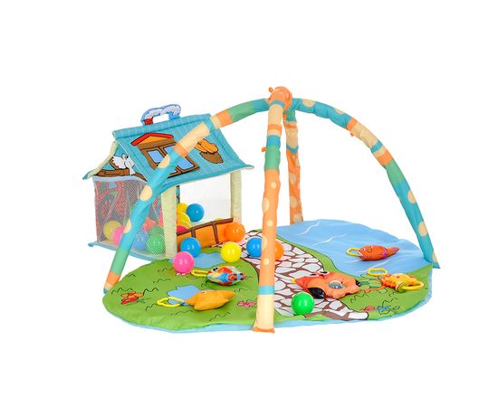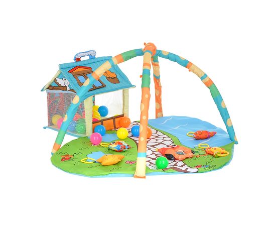 Комплектация: коврик, 2 дуги, домик, 5 подвесок-игрушек, 30 мячиков