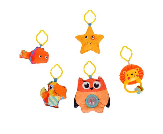 • благодаря съемным кольцам и петелькам на мягких дугах, игрушки-подвески легко снимаются, их можно повесить на кроватку или в коляску;
