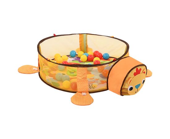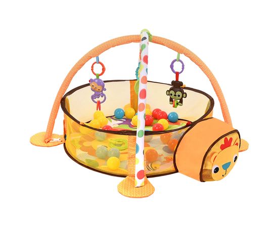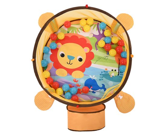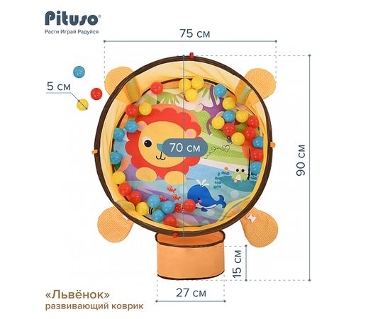 В комплекте с ковриком 30 разноцветных шариков (Ø 5 см), с которыми можно также играть, а после игр компактно хранить в голове Львенка.