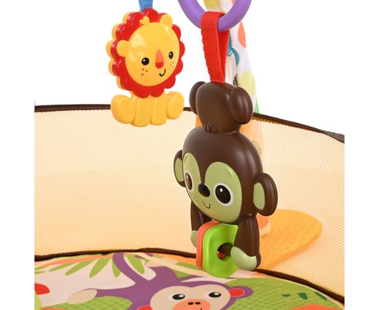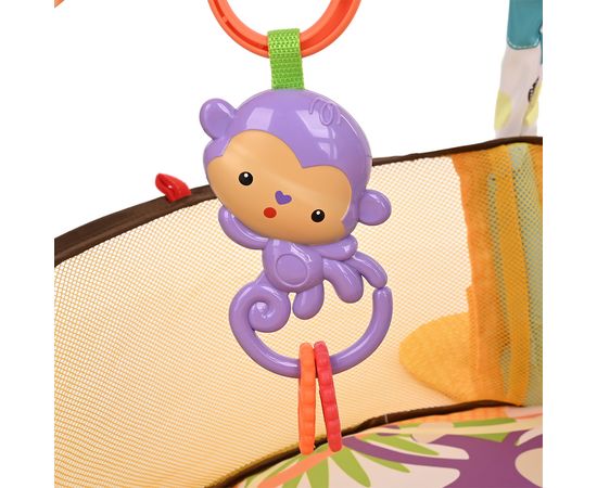 0-2 месяца: Малыш играет на спинке лёжа. На самом раннем этапе своего развития малыш тянется за яркими, притягивающими внимание игрушками и учится их хватать. В комплекте с ковриком прилагаются 4 подвесные пластиковые игрушки и грызунок, яркие и привлекательные, они служат для развития тактильных ощущений и зрения.