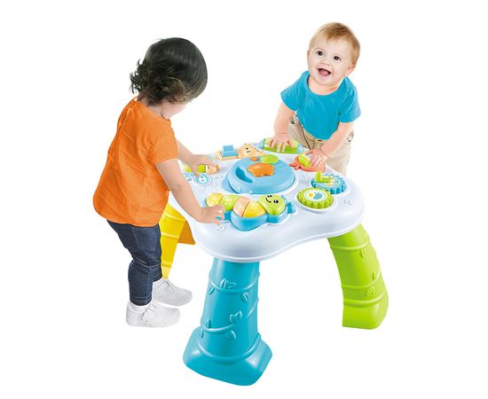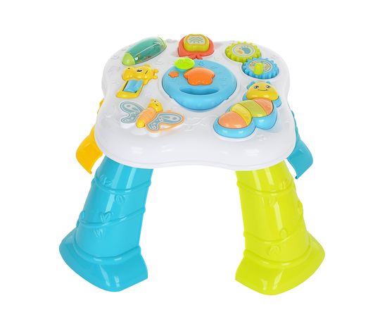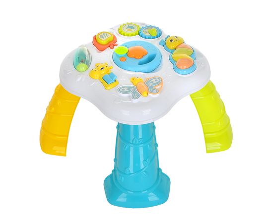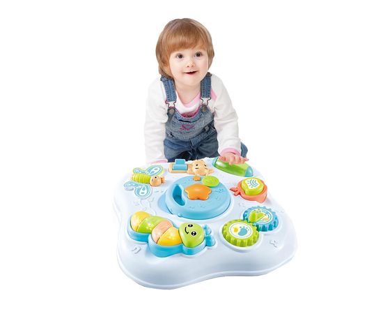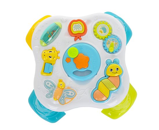 Столик оснащен различными элементами, которые издают звуки, светятся, пищат, крутятся.
