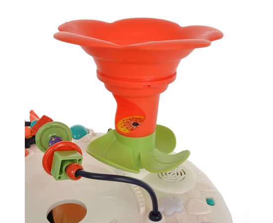 На игровой поверхности имеется спуск для шарика в виде цветка, рычаги и кнопочки, маленький крокодильчик и многое другое.