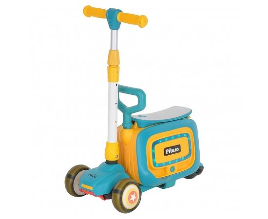 Самокат 3 в 1 ( самокат, беговел, каталка). Интересное решение от бренда Pituso сделают прогулки веселыми и интересными. Самокат состоит из двух частей, которые можно использовать как вместе с самокатом, так и без. Основные функции: 3-х колесный складной самокат, беговел и каталка. Самокат состоит из двух частей, вторая часть съемная и может использоваться отдельно, с помощью встроенных колес превращается в каталку. Под сиденье расположен удобный багажник куда ребенок может положить небольшие игрушки. Самокат оснащен различными мелодиями (на английском языке), колеса самоката светятся, а каталка имеет разноцветную подсветку.