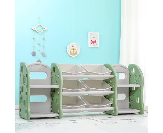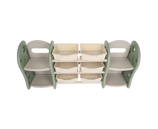 Стеллаж для игрушек с ящиками и полками выполнен из качественного пластика. Данный материал экологичен и прост в чистке. Небольшой вес стеллажа и его устойчивая конструкция обеспечивают ребёнку безопасность от ушибов.