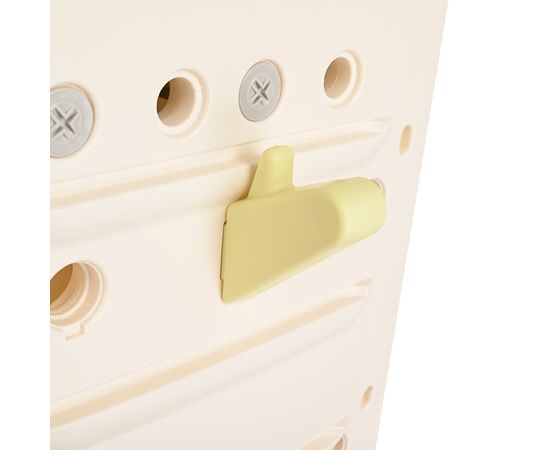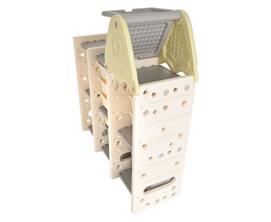 Стеллаж для игрушек с ящиками и полками выполнен из качественного пластика. Данный материал экологичен и прост в чистке. Небольшой вес стеллажа и его устойчивая конструкция обеспечивают ребёнку безопасность от ушибов.