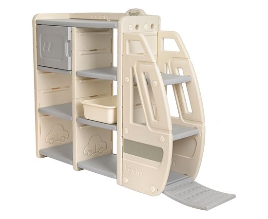 Стеллаж имеет необычный дизайн, что привлечет ребенка к самостоятельной уборке своих вещей.
