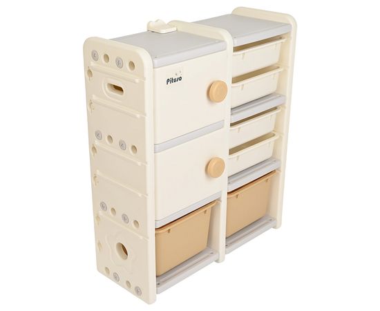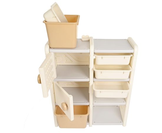 Стеллаж для игрушек с ящиками и полками выполнен из качественного пластика. Данный материал экологичен и прост в чистке. Небольшой вес стеллажа и его устойчивая конструкция обеспечивают ребёнку безопасность от ушибов.