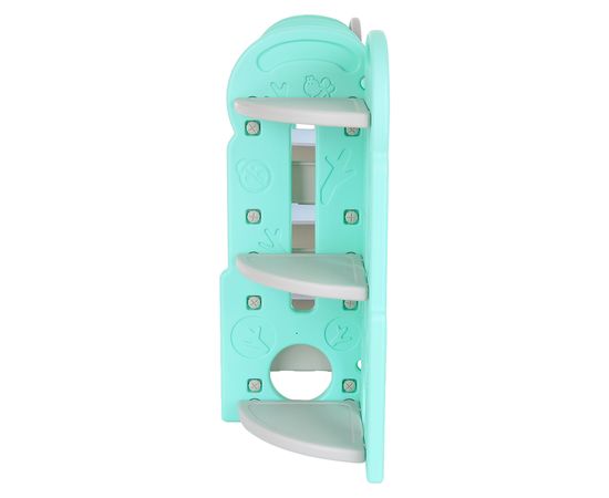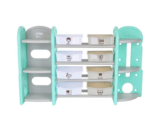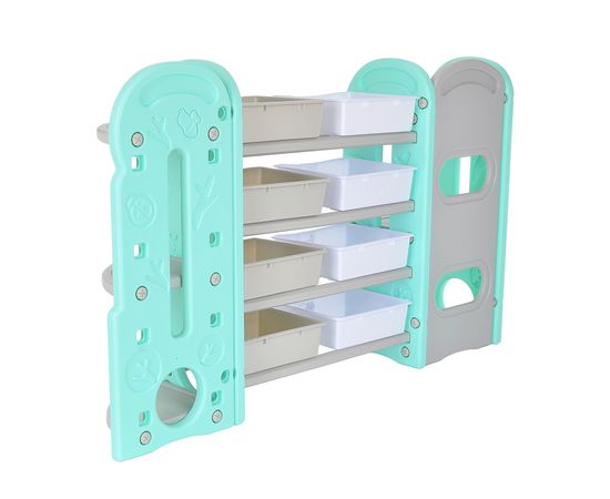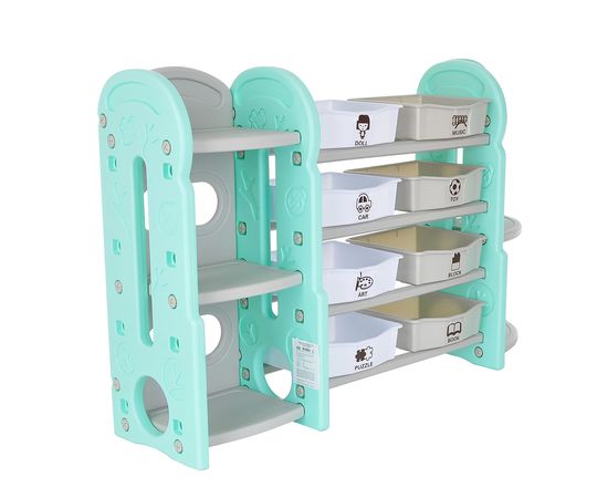 Стеллаж для игрушек с ящиками и полками выполнен из качественного пластика. Данный материал экологичен и прост в чистке. Небольшой вес стеллажа и его устойчивая конструкция обеспечивают ребёнку безопасность от ушибов.