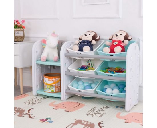 Стеллаж для игрушек с ящиками и полками выполнен из качественного пластика. Данный материал экологичен и прост в чистке. Небольшой вес стеллажа и его устойчивая конструкция обеспечивают ребёнку безопасность от ушибов.