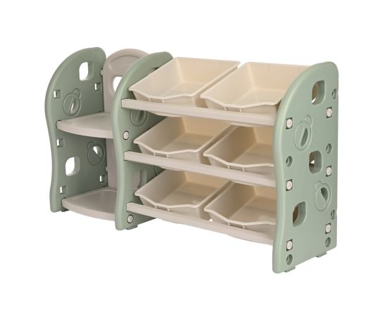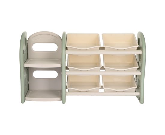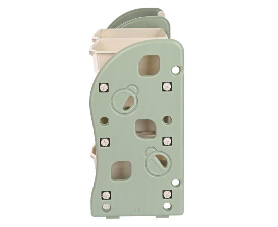 Стеллаж для игрушек с ящиками и полками выполнен из качественного пластика. Данный материал экологичен и прост в чистке. Небольшой вес стеллажа и его устойчивая конструкция обеспечивают ребёнку безопасность от ушибов.