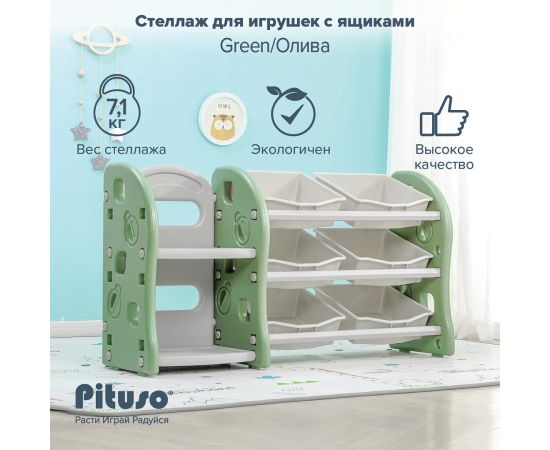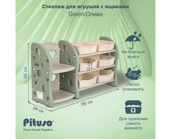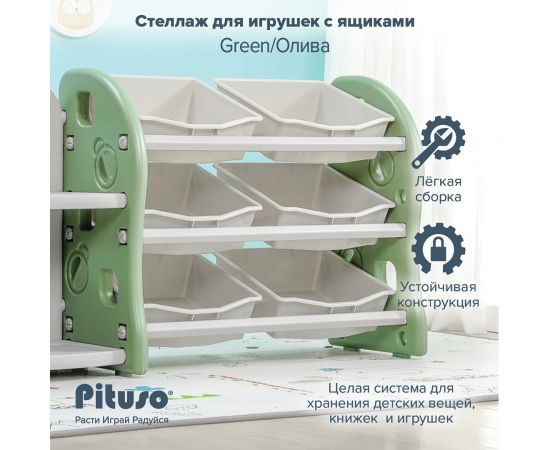 PITUSO Стеллаж для игрушек с ящиками и приставкой (книжная),3 полки,Green/Олива,116*34*66