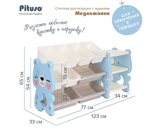 PITUSO Стеллаж для игрушек с ящиками Медвежонок,3 полки,Blue/Голубой,123*33*65h