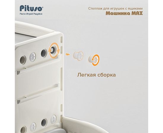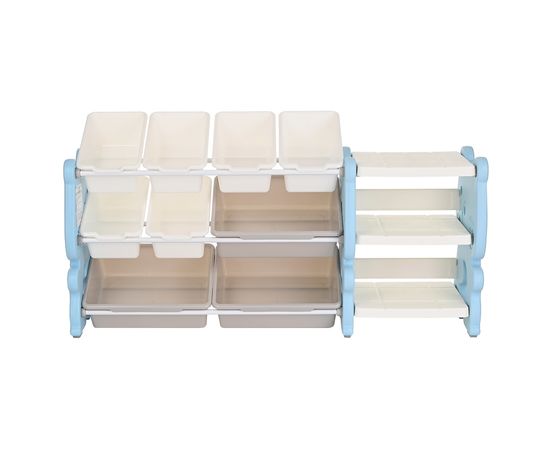 Стеллаж для игрушек с ящиками и полками выполнен из качественного пластика. Данный материал экологичен и прост в чистке. Небольшой вес стеллажа и его устойчивая конструкция обеспечивают ребёнку безопасность от ушибов.