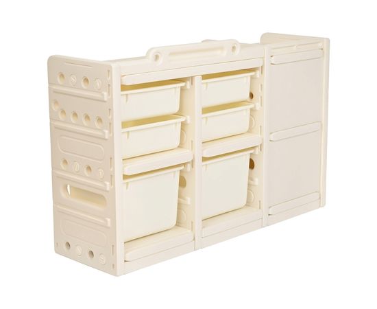 Стеллаж для игрушек с ящиками и полками выполнен из качественного пластика. Данный материал экологичен и прост в чистке. Небольшой вес стеллажа и его устойчивая конструкция обеспечивают ребёнку безопасность от ушибов.