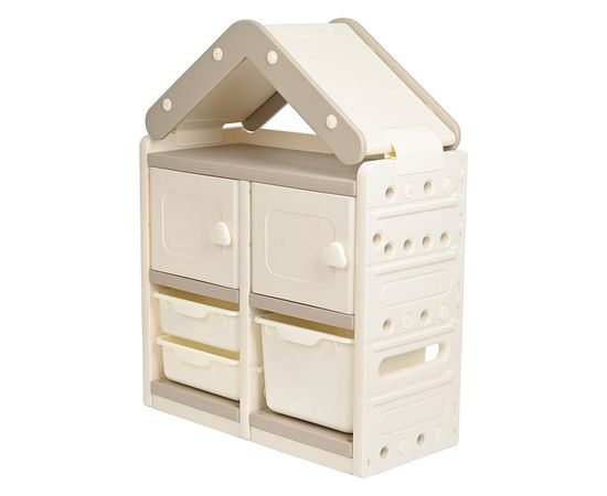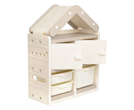 Стеллаж для игрушек с ящиками и полками выполнен из качественного пластика. Данный материал экологичен и прост в чистке. Небольшой вес стеллажа и его устойчивая конструкция обеспечивают ребёнку безопасность от ушибов.