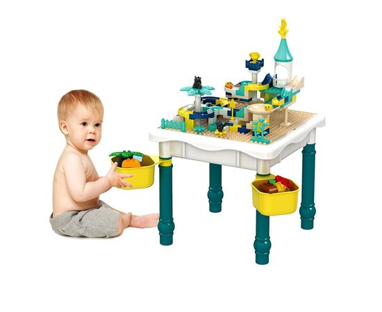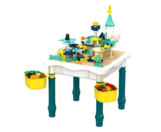 В столе имеются специальные ячейки для хранения. Из элементов конструктора можно собрать многоуровневый замок с дорожками.