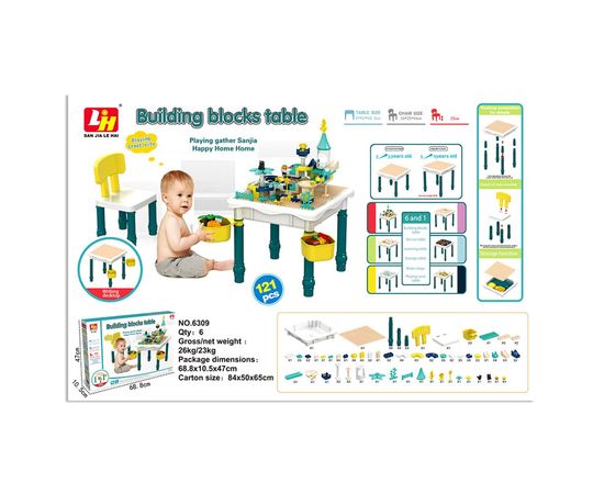 В наборе: стол для конструирования + 1 стульчик + конструктор 121 элемент.