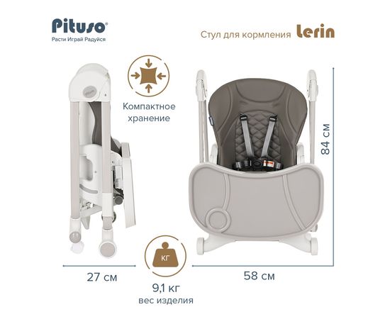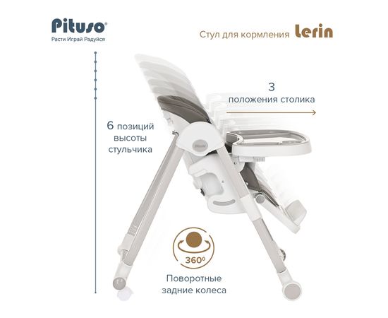Стульчик Pituso LERIN - функциональный и удобный стульчик для кормления. Алюминиевая рама создает устойчивость и надежность, а задние колесики оснащены педалью тормоза. Безопасная конструкция с мягким сидением легко чистится и компактно складывается. Съемный столик подгоняется в наилучшее положение для кормления, а лоток для приема пищи легко моется. Высоту стульчика Pituso LERIN можно настроить в 6 положениях. Пятиточечные страховочные ремни безопасности позволят весело проводить время с малышом, не опасаясь, что он вывалится наружу. Свободно регулируемый угол наклона спинки и 3-х ступенчатая регулировка подножки позволит ребенку сладко вздремнуть после приема пищи. Современная эргономичная форма прекрасно впишется в любой интерьер.