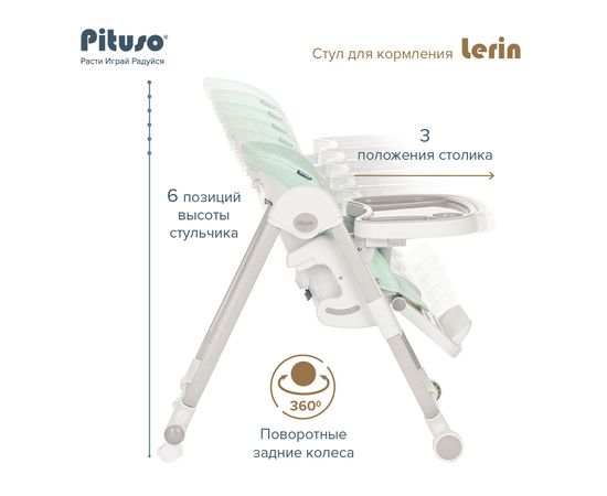 Стульчик Pituso LERIN - функциональный и удобный стульчик для кормления. Алюминиевая рама создает устойчивость и надежность, а задние колесики оснащены педалью тормоза. Безопасная конструкция с мягким сидением легко чистится и компактно складывается. Съемный столик подгоняется в наилучшее положение для кормления, а лоток для приема пищи легко моется. Высоту стульчика Pituso LERIN можно настроить в 6 положениях. Пятиточечные страховочные ремни безопасности позволят весело проводить время с малышом, не опасаясь, что он вывалится наружу. Свободно регулируемый угол наклона спинки и 3-х ступенчатая регулировка подножки позволит ребенку сладко вздремнуть после приема пищи. Современная эргономичная форма прекрасно впишется в любой интерьер.