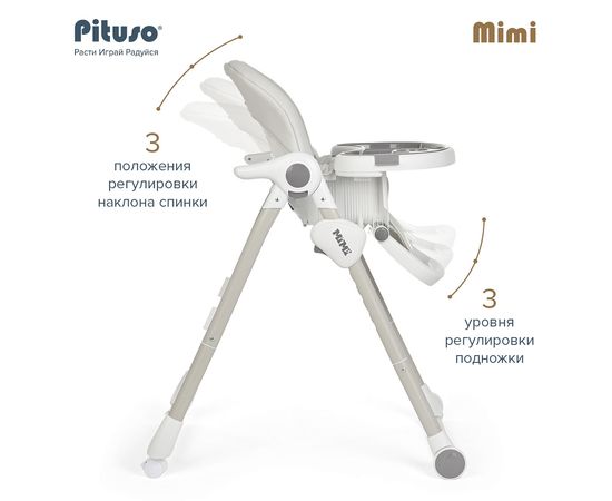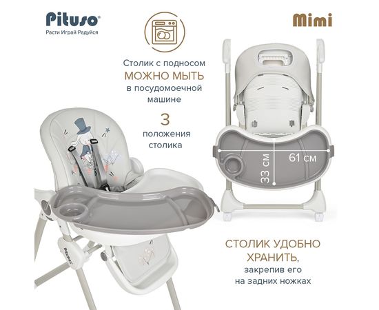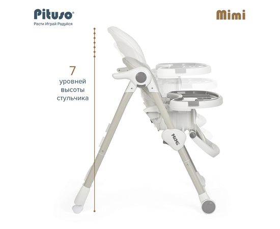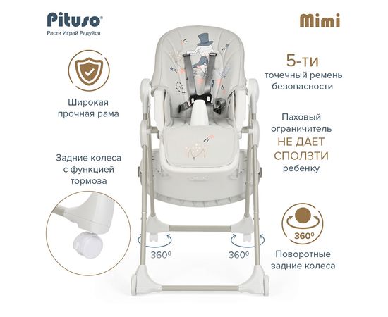Pituso MiMi – устойчивый и комфортный стульчик для кормления. Надежная алюминиевая рама с безопасными для напольных покрытий колесиками. Безопасная конструкция с мягким съемным сидением легко чистится и компактно складывается. 3 позиции для регулировки столика позволят настроить наилучшее положение для кормления, а лоток для приема пищи отлично моется в посудомоечной машине. Пятиточечные страховочные ремни безопасности помогут весело проводить время с малышом, не опасаясь, что он вывалится наружу. Угол наклона спинки фиксируется в 3 положениях, 3-х ступенчатая регулировка подножки позволит ребенку сладко вздремнуть после приема пищи. Современная эргономичная форма прекрасно впишется в любой интерьер.