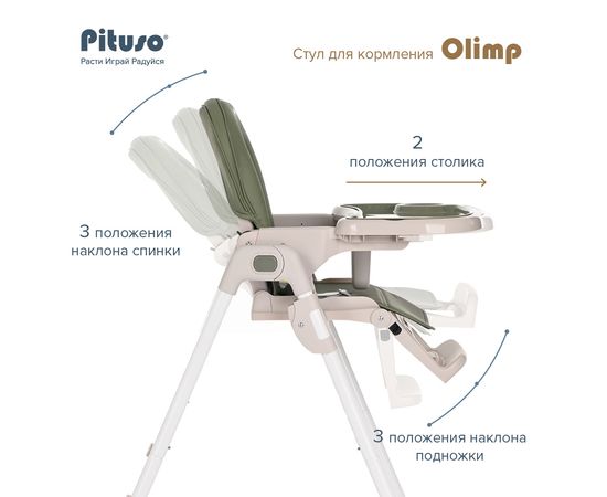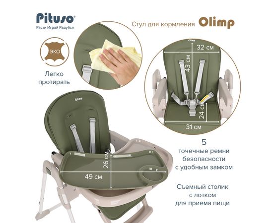 Стульчик Pituso OLIMP функциональный и удобный стульчик для кормления. Алюминиевая рама создает устойчивость и надежность, а задние колесики оснащены педалью тормоза. Безопасная конструкция с мягким сидением легко чистится и компактно складывается. Съемный столик подгоняется в наилучшее положение для кормления, а лоток для приема пищи легко моется. Высоту стульчика Pituso OLIMP можно настроить в 7 положениях. Пятиточечные страховочные ремни безопасности позволят весело проводить время с малышом, не опасаясь, что он вывалится наружу. Свободно регулируемый угол наклона спинки в 3-х положениях и 3-х ступенчатая регулировка подножки позволит ребенку сладко вздремнуть после приема пищи. Современная эргономичная форма прекрасно впишется в любой интерьер. Стульчик оснащен 2 колесиками на задних ножках. Отличительная особенность данной модели удобное и быстрое сложение одной кнопкой, модель очень компактная и удобная в быту, не занимает много места в сложенном виде, а с помощью колесиков легко перемещать по комнате.